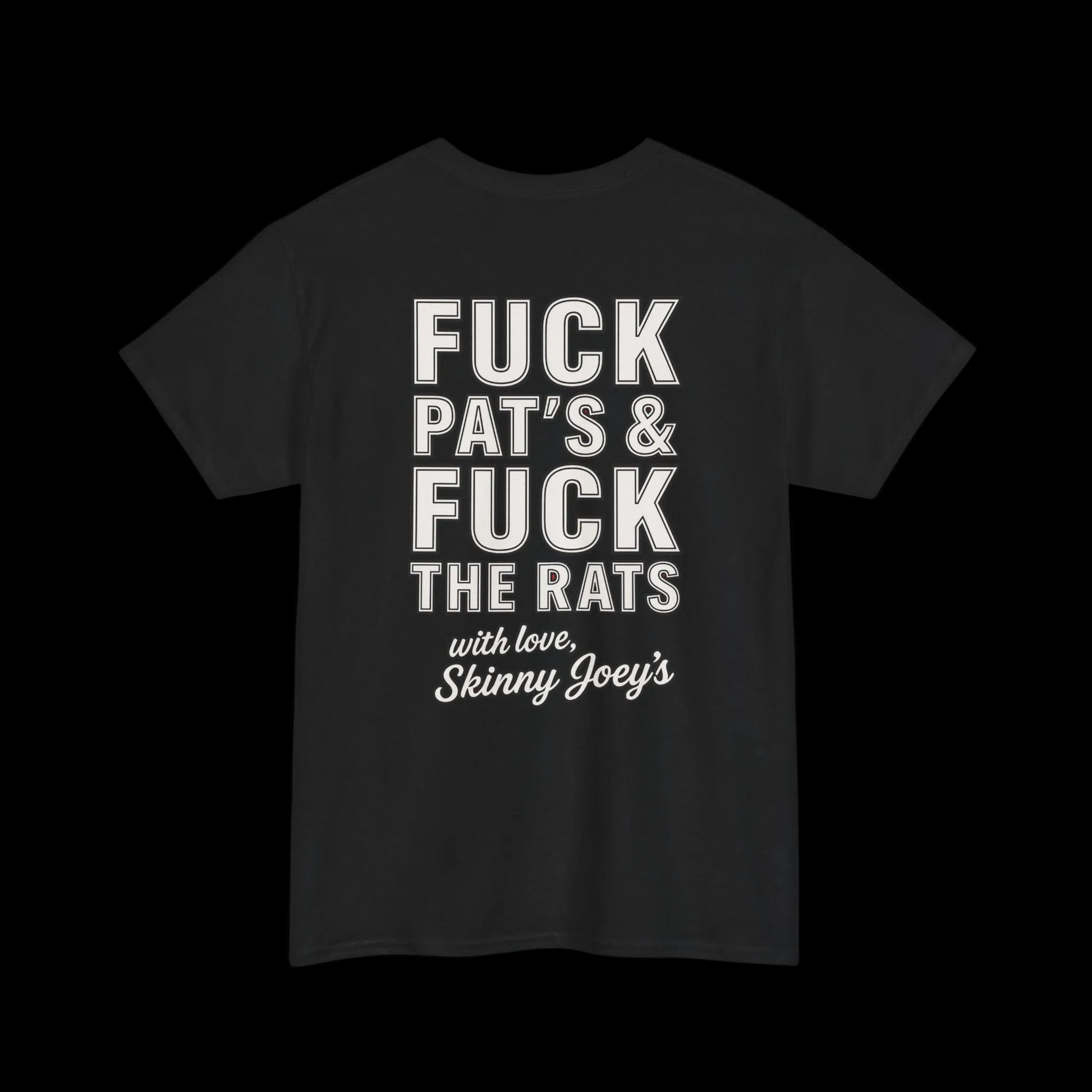 Crafted from premium Gildan 5000 Heavy Cotton, this unisex tee delivers comfort, durability, and a perfect streetwear fit. The front features the unapologetic slogan “F** Pat’s & F*** The Rats — With Love, Joey Merlino”* in bold, high-contrast lettering that captures the spirit of South Philly pride. Designed for those who stand on business and never fold, this shirt represents more than a message—it’s a movement.