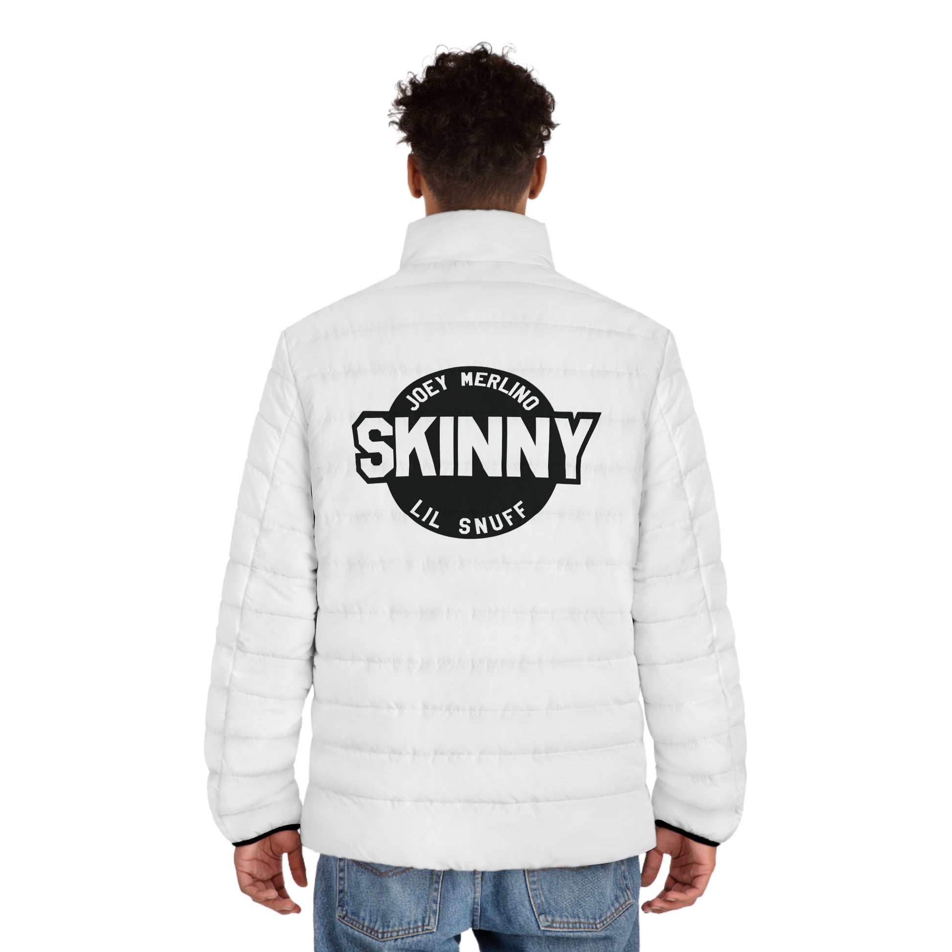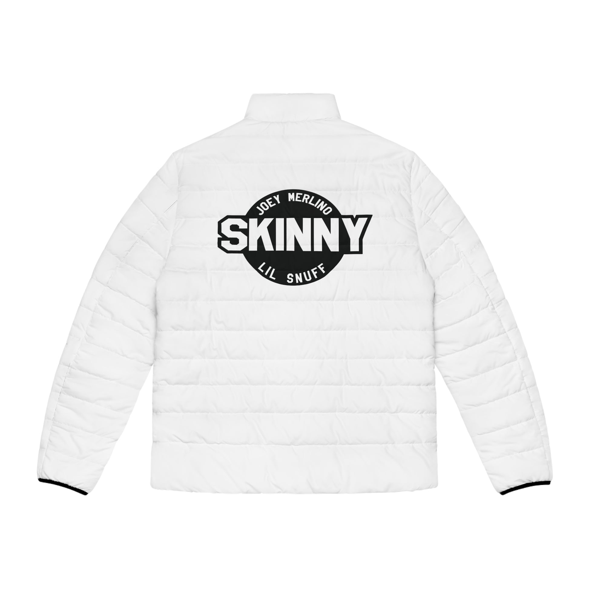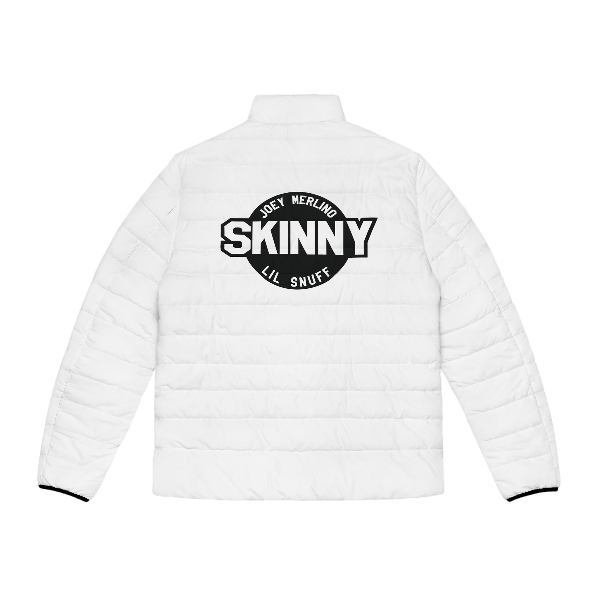 A soft cotton-like black lining adds quiet warmth against the skin, while hidden pockets keep your essentials close and secure. The smooth front zip moves easily, and elastic cuffs seal in heat without restricting your motion. Finished in crisp white with subtle navy trim and a small Skinny Joey script detail on the sleeve, the look is understated but unmistakably intentional — the kind of piece that speaks without shouting.