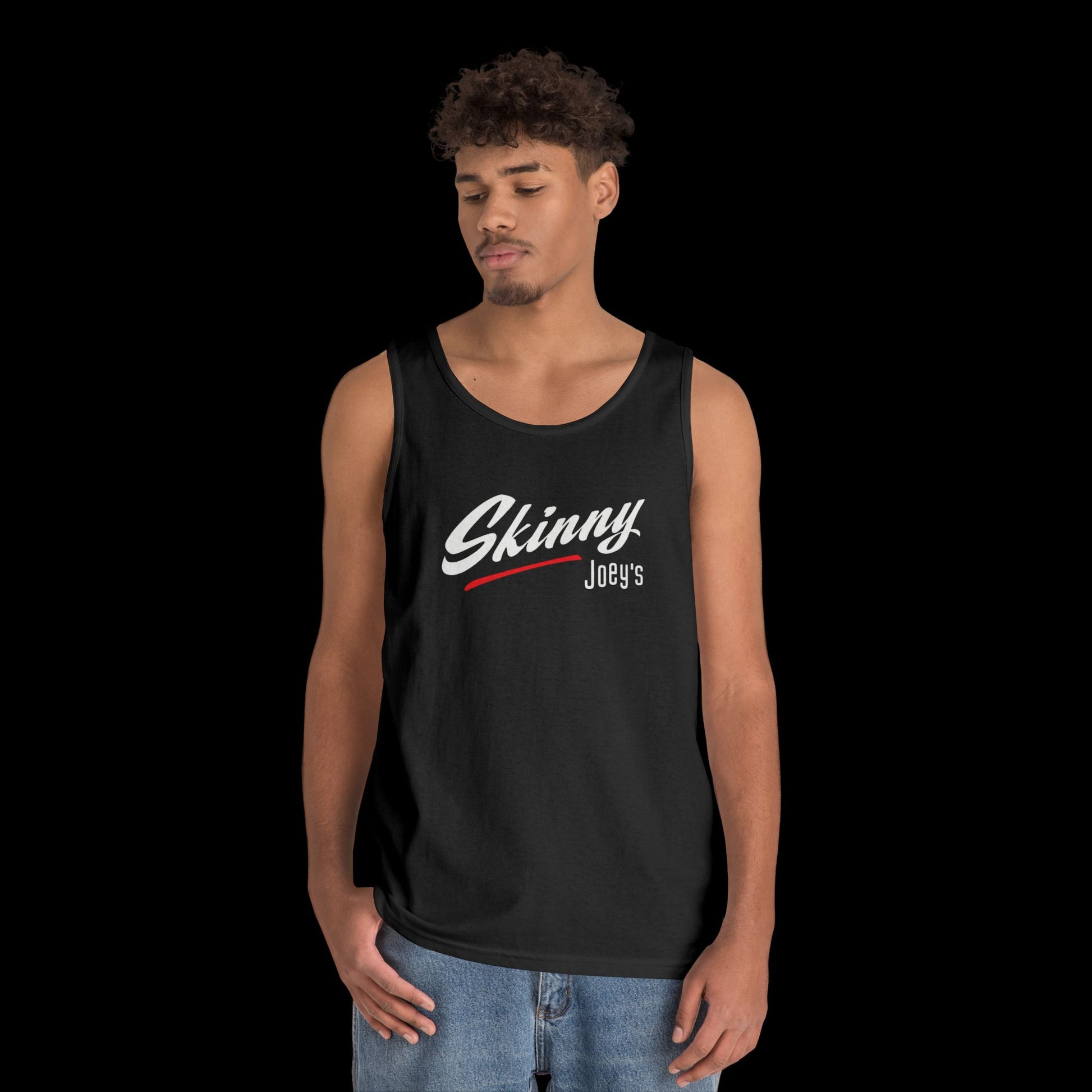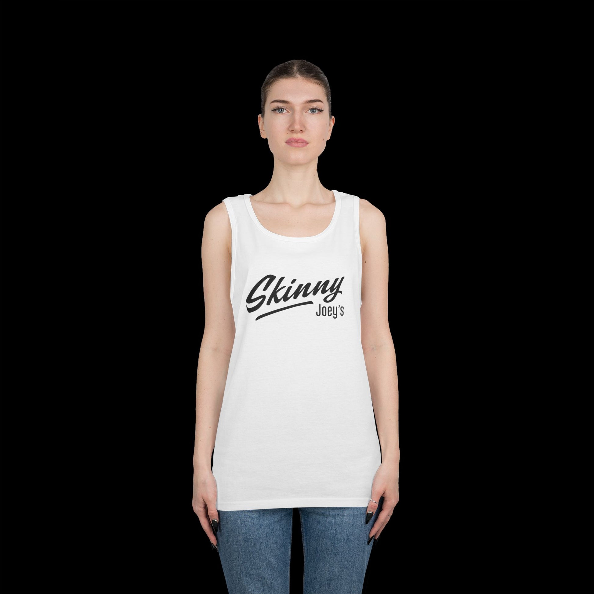 Simple and classic SKINN YJOEY logo on a Unisex Heavy Cotton Tank Top, perfect for casual wear. This tank gives off a trendy and urban vibe, suitable for everyday wear or as a workout top. Ideal for those who appreciate minimalist designs. Relevant for streetwear enthusiasts, gym-goers, and those who enjoy laid-back style. Perfect for summer, festivals, and outdoor activities.