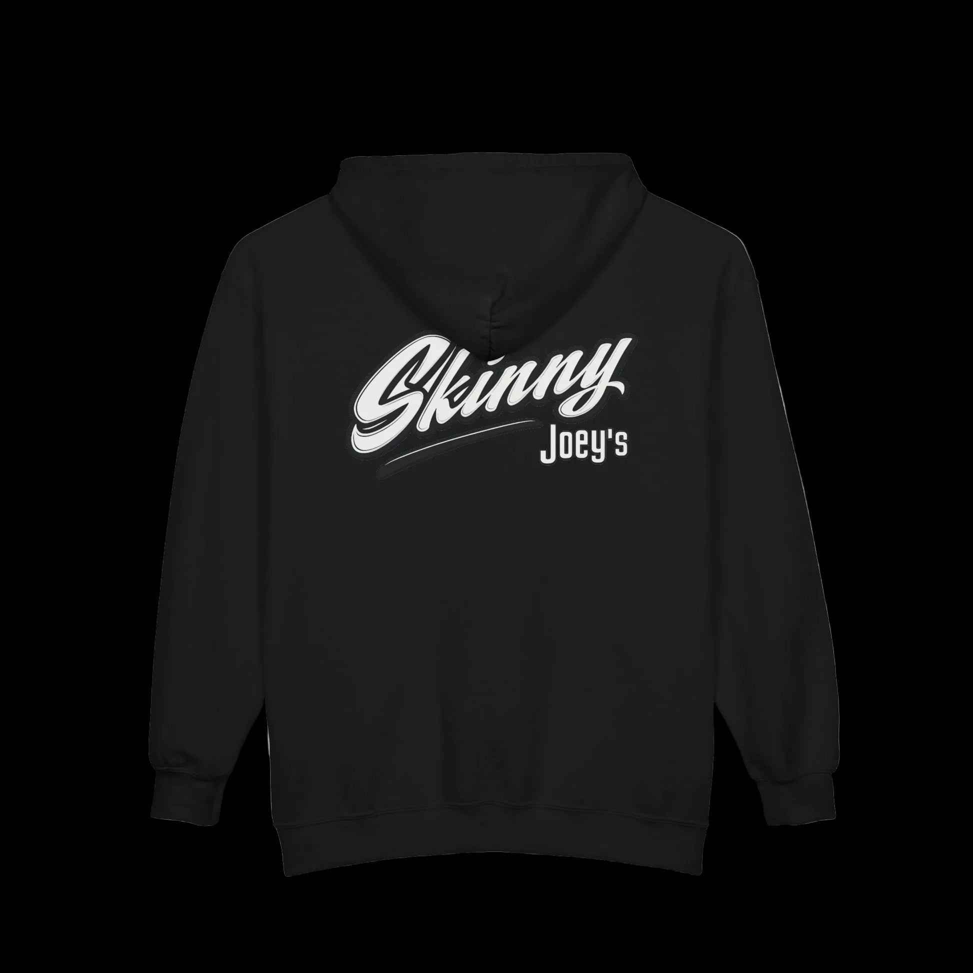 This zip-up hoodie carries a quiet, lived-in energy — the kind you reach for after late shifts, open-mic nights, or when the coffee shop closes and the city feels like it belongs to you. The black fabric wears in softly over time while the vintage-inspired "Skinny Joey's" script on the left chest and bold logo on the back give it a retro bar-badge vibe. Zippered front and roomy pockets hold your essentials. The hood and adjustable drawcord add a little shelter against wind and neon lights. It’s comfortable, dependable, and looks like it’s already part of your story.
