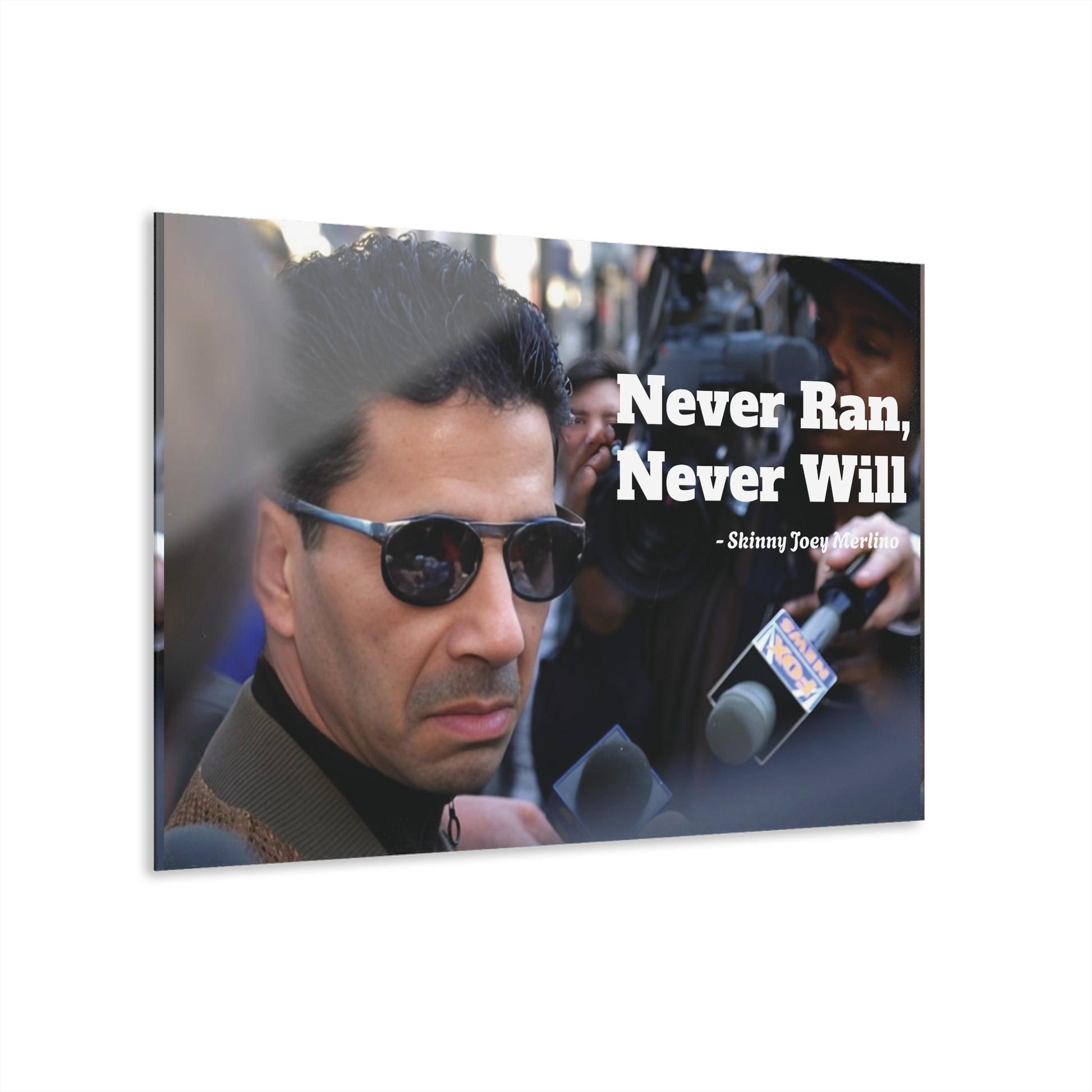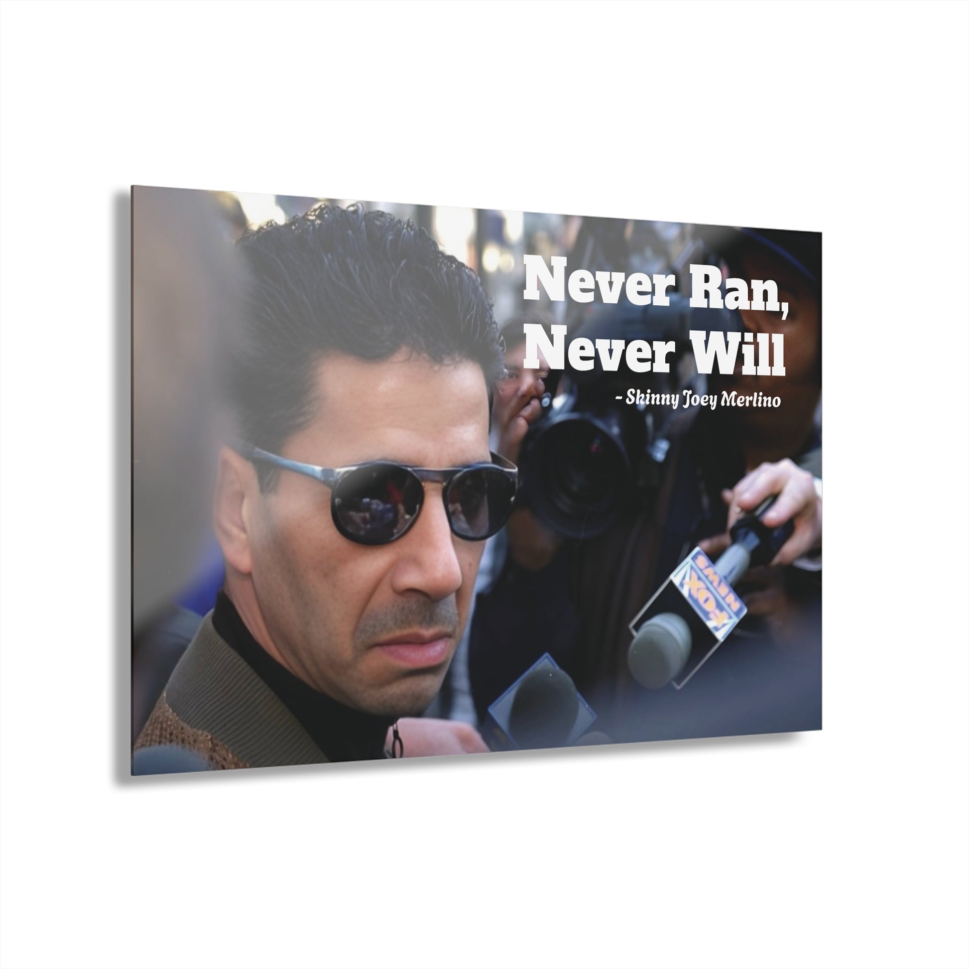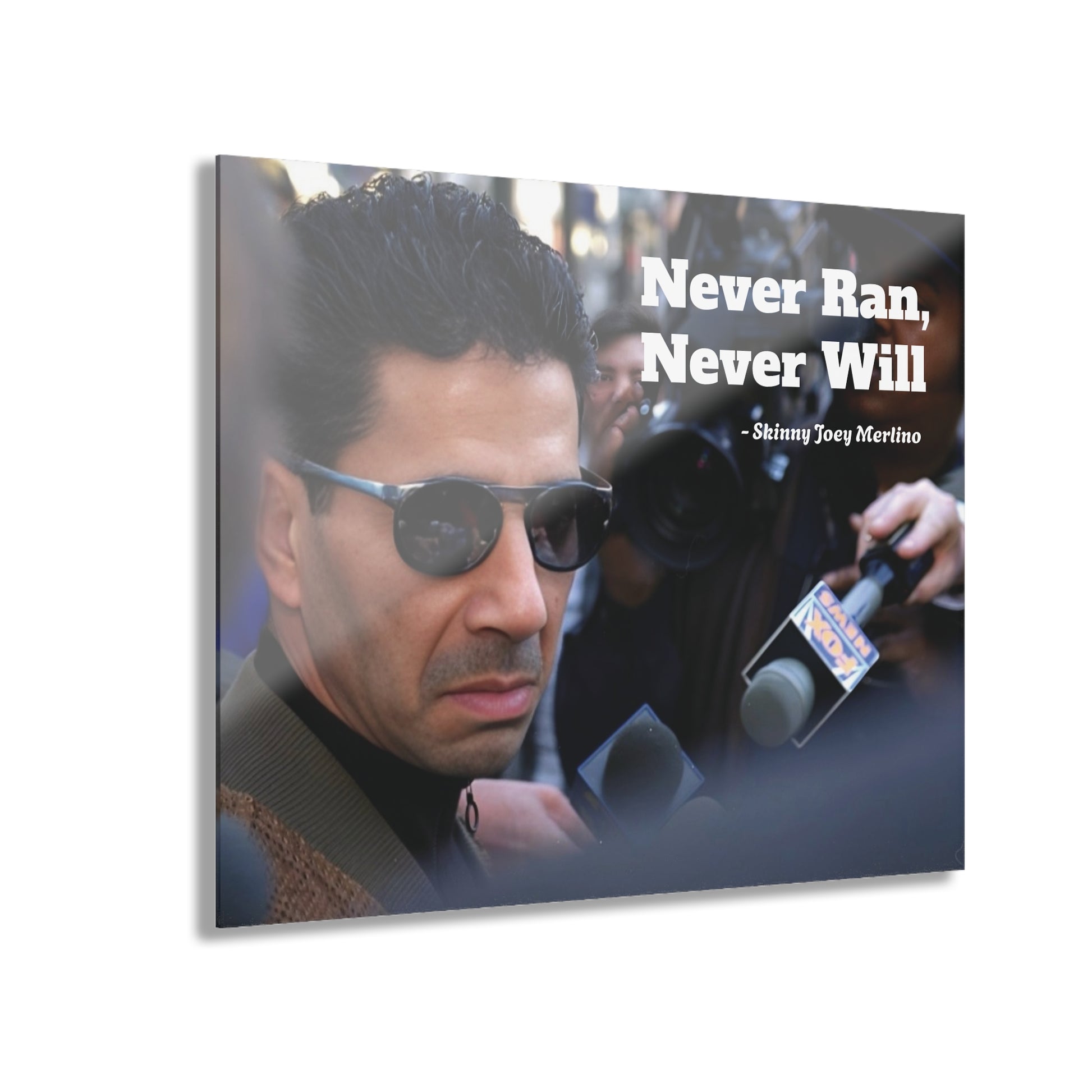 Capture the raw intensity of a real South Philly legend with this exclusive acrylic wall art featuring Skinny Joey Merlino walking tall through a storm of reporters. Taken from the iconic courtroom chaos of the 1990s, this piece freezes a moment of resilience, pride, and street loyalty — immortalized with the bold quote that says it all: “Never Ran, Never Will.”