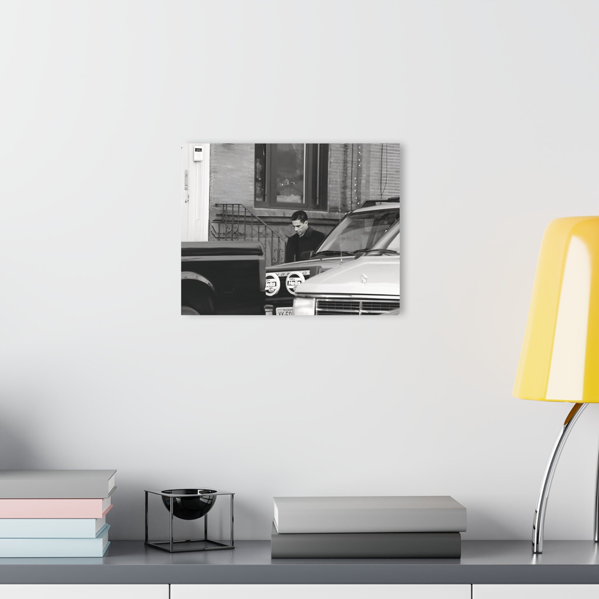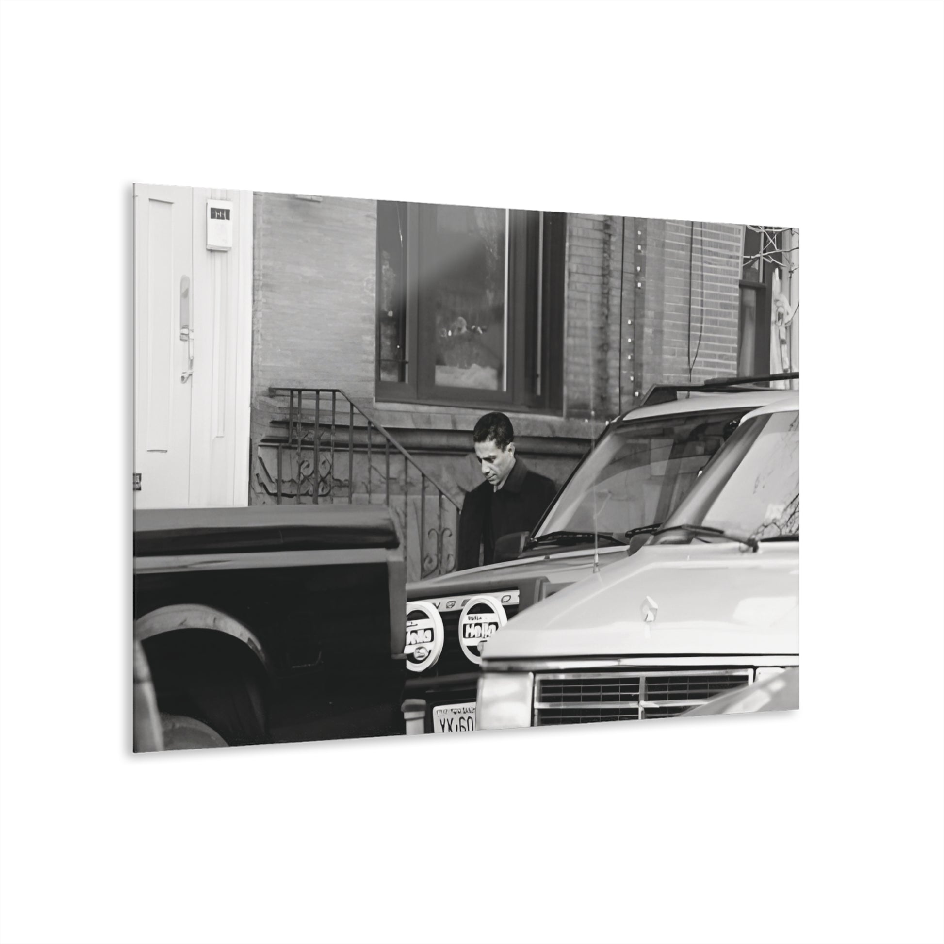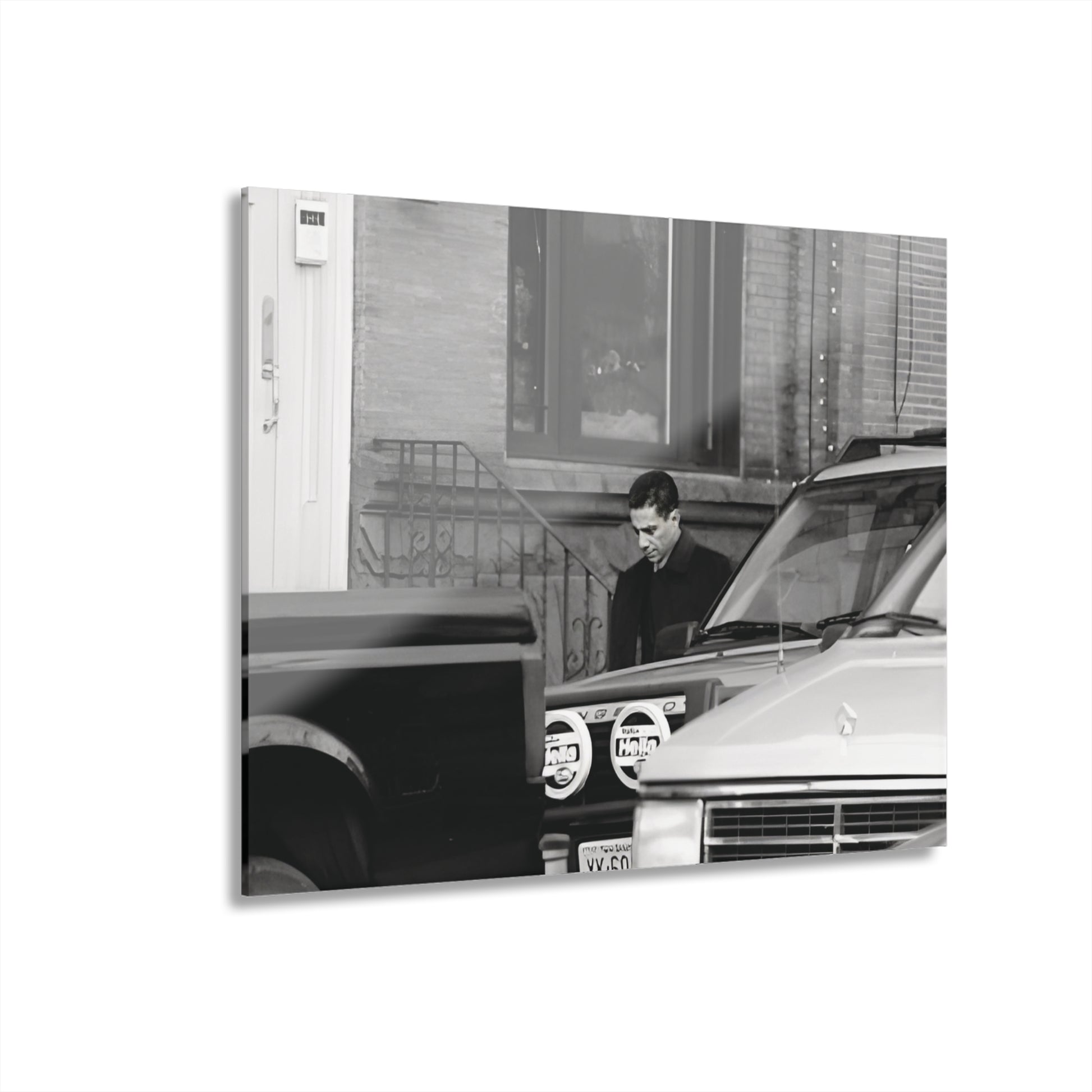 This black-and-white acrylic print captures the raw tension of street life under the watchful eye of the law. Surrounded by vintage cars and brick rowhomes — frozen in a moment that feels more like a still from a crime thriller than real life. Skinny Joey ended up beating the Government at Trial with his Life on the line due to lying government informants.